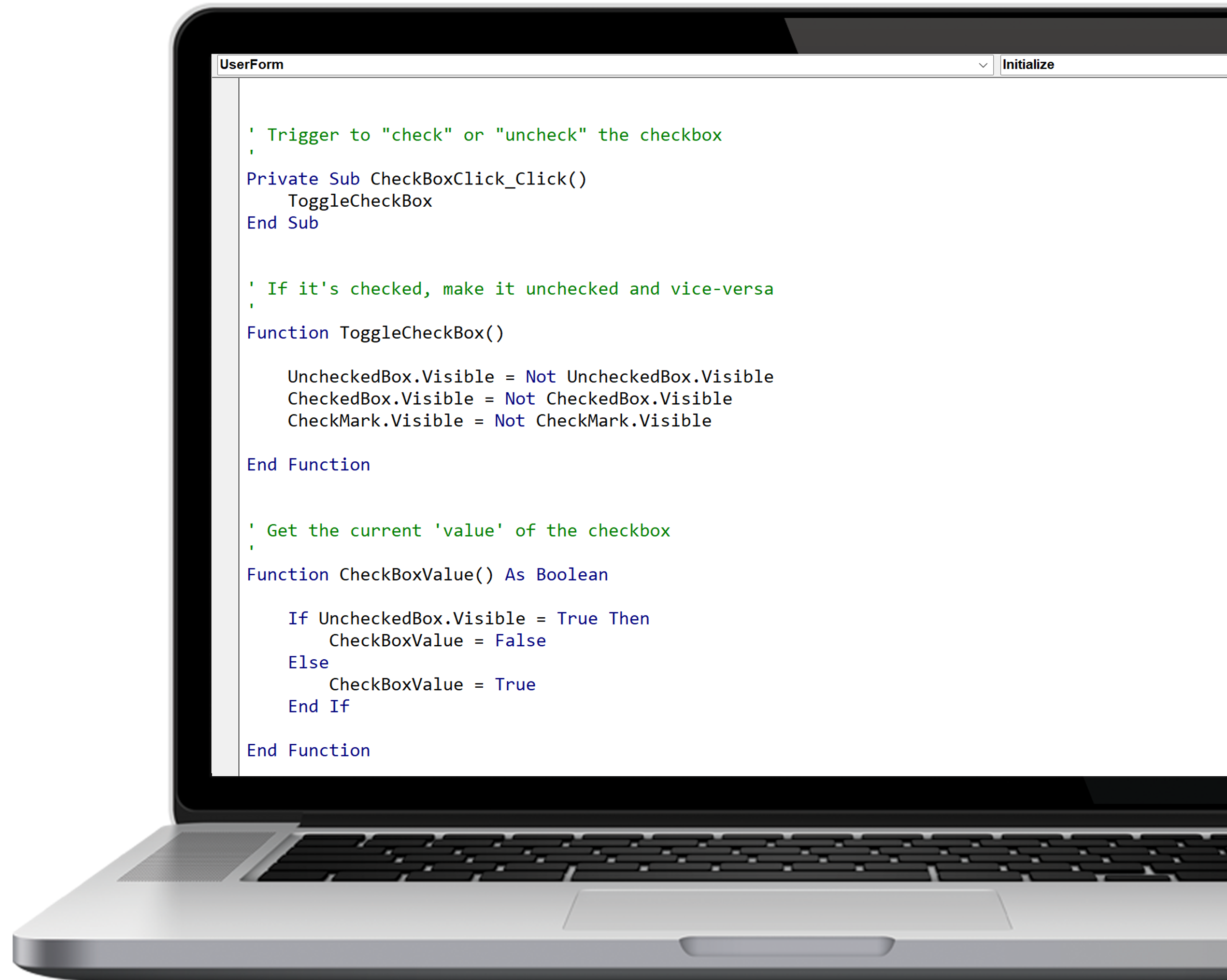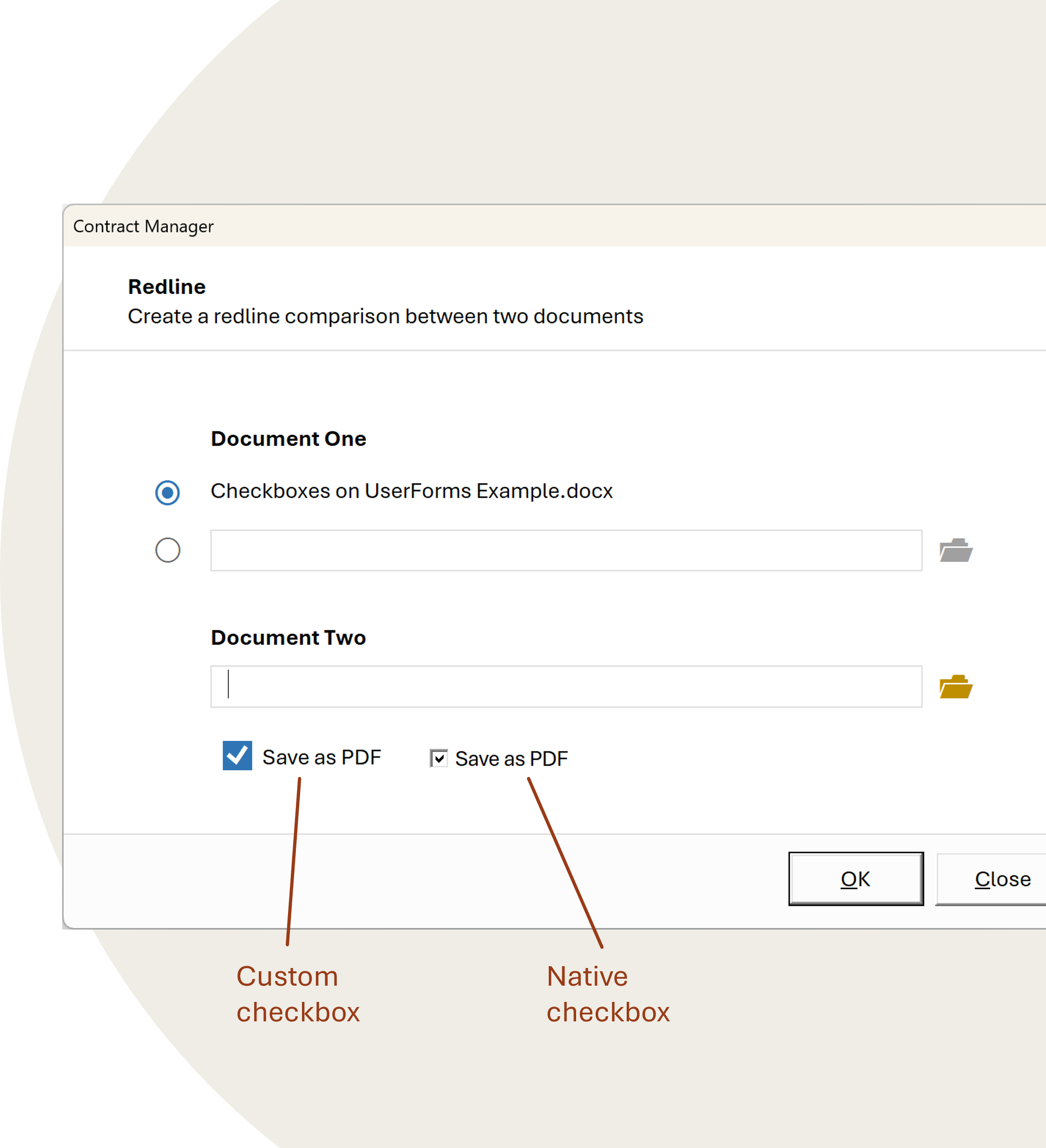 Here’s an example showing the “custom” checkbox compared to the native checkbox you normally find on Excel Userforms. The custom is the blue one on the left in case you couldn’t tell 😐.
