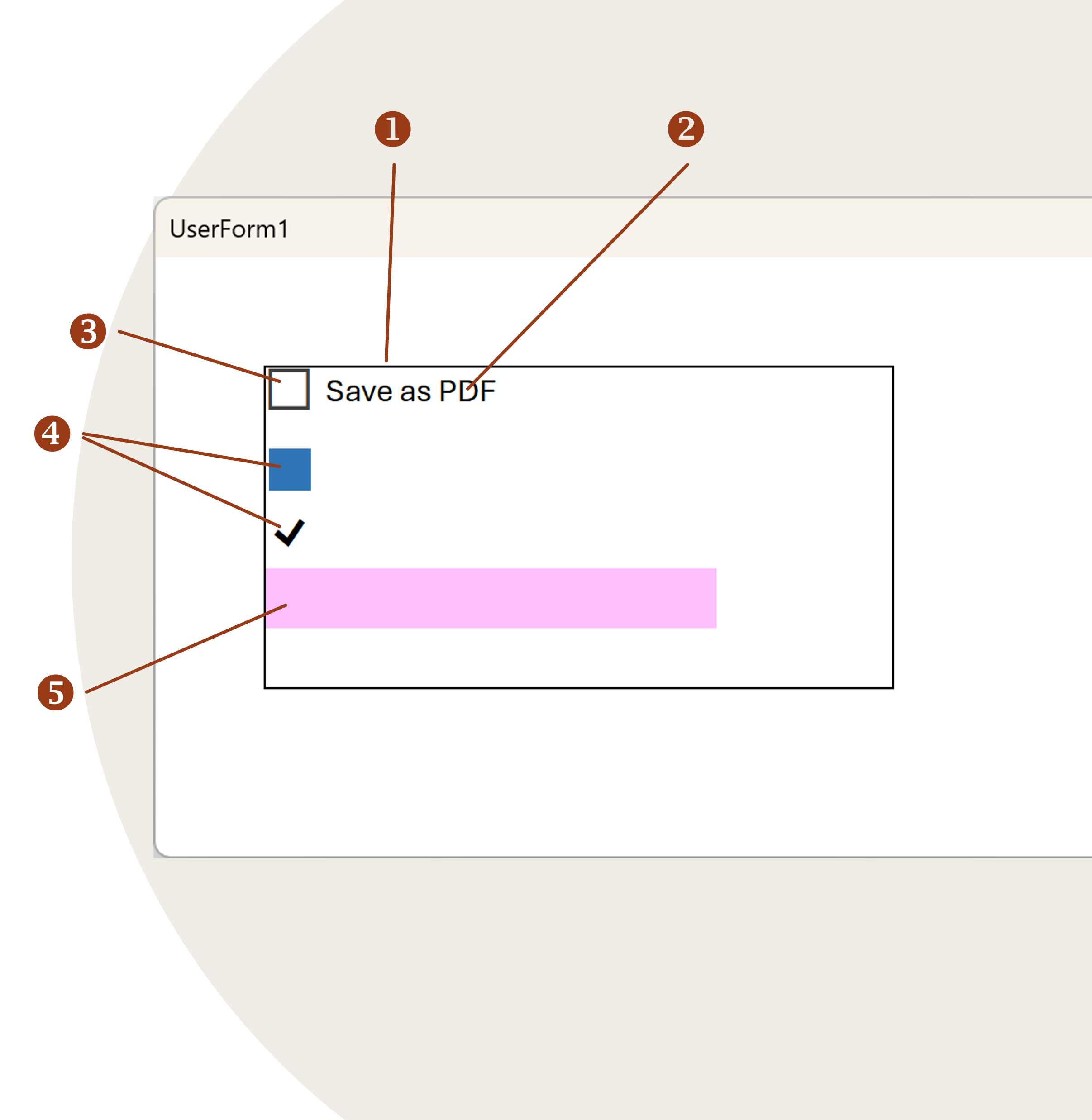 The checkbox is made up of 6 standard Userform controls you can see on the pull-apart image below: