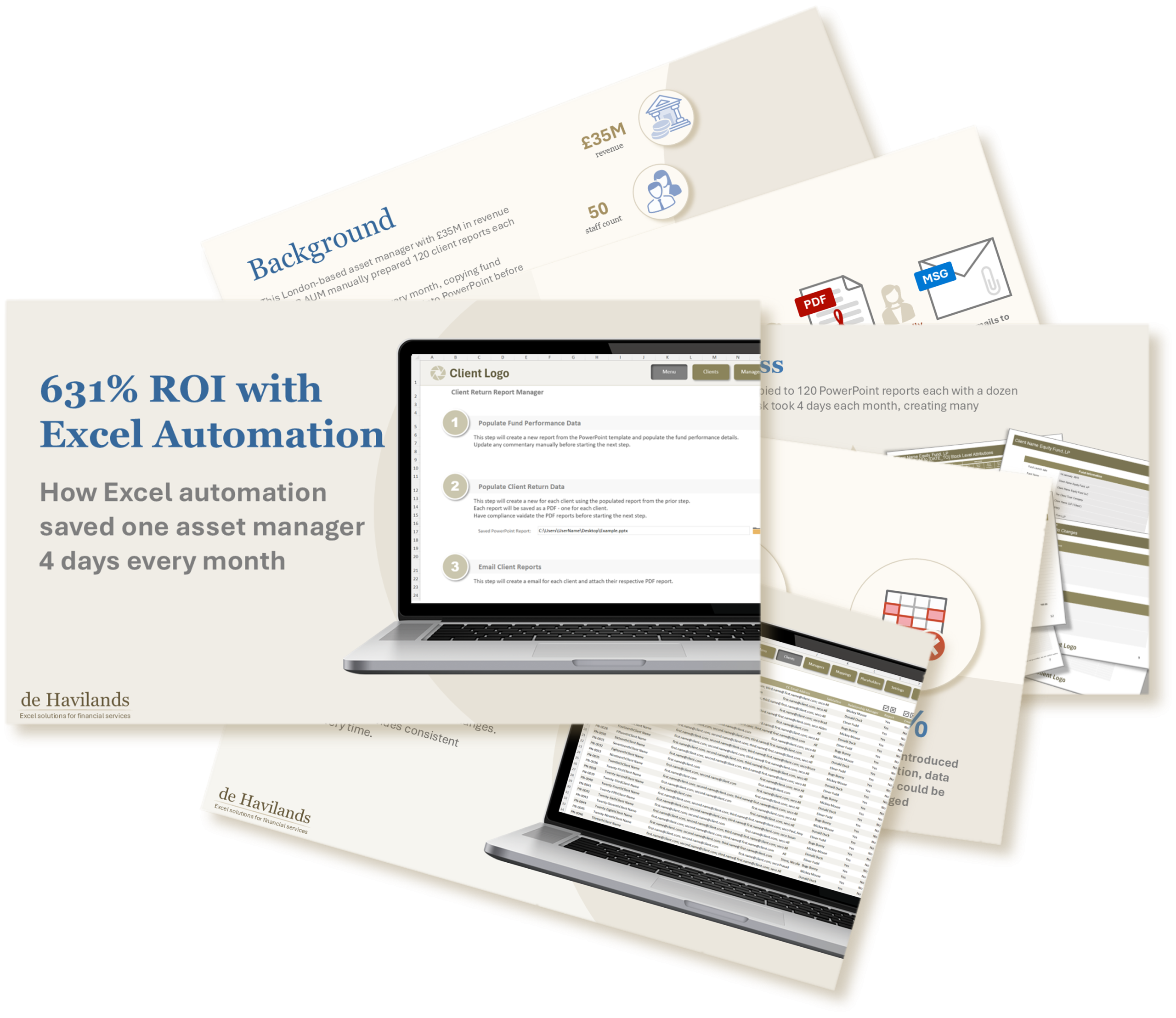 Discover how Excel automation can drive measurable results. This exclusive portfolio showcases over 30 high-impact projects, each designed to streamline workflows, save time, and reduce operational risks for financial services firms. Download now to see real examples of how we’ve helped firms like yours achieve ROI gains of up to 631%.